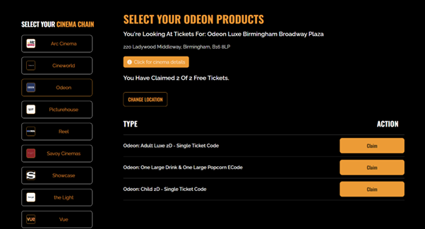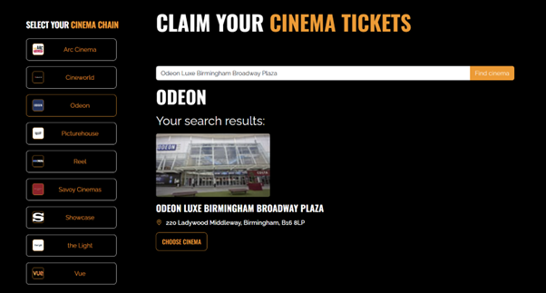 - Monthly Cinema Delights: Your team or customers will receive a monthly allocation of 1 or 2 cinema tickets for 3, 6, or 12 months. From thrilling action flicks to heartwarming romances, they can experience the magic of the movies like never before. This includes access to over 350 cinemas nationwide, including Arc, Cineworld, Odeon, Picturehouse, Reel, Savoy, Showcase, The Light, and Vue Cinemas, allowing them to see any movie, any day, any time.