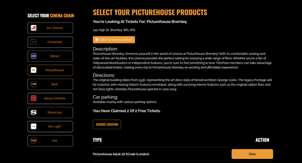 Redeeming tickets is straightforward: each month, members’ FILMPASS accounts are automatically credited with their selected number of cinema tickets. Members can redeem these tickets anytime during the month, up until their membership expires. For added convenience, there is no need for a bank card to claim tickets or enjoy a film. FILMPASS PRIME+ covers 350+ cinemas, including Arc, Cineworld, Odeon, Picturehouse, Reel, Savoy, Showcase, the Light, and Vue Cinemas.
